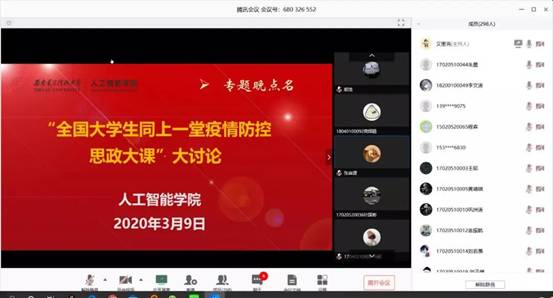 大课结束后,国产的菊眼屁股HD辅导员杨坤和白璐芸,分年级组织召开了线上的主题晚点名—“全国大学生同上一堂疫情防控思政大课”大讨论,通过腾讯视频、哔哩哔哩等直播软件,与全体智能学子交流分享了听课感受。通过学习,同学们纷纷表示对疫情有了更生动全面的了解,对我国社会制度有了更深度的自信,对青年一代的使命担当有了更清晰的认识。