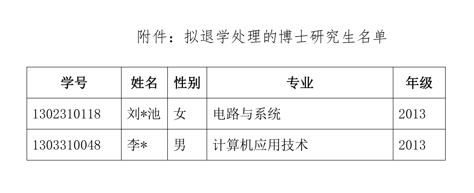 根据教育部《普通高等学校学生管理规定》第三十条和《西安电子科技大学研究生学籍管理实施细则》第二十六条有关规定,学校拟对超过最长学习年限的博士研究生作退学处理,现将名单(见附件)予以公告,公告期为2021年6月8日-2021年6月22日。