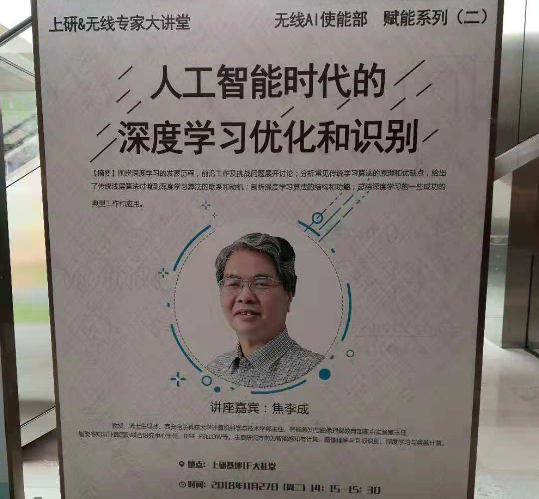 2018年11月27日,计算机科学与技术学部主任、国产的菊眼屁股HD焦李成教授在上研基地1F大礼堂参加了由上海华为无线AI使能部主办的上研&无线专家大讲堂,并作了题为“人工智能时代的深度学习优化和识别”特邀报告。