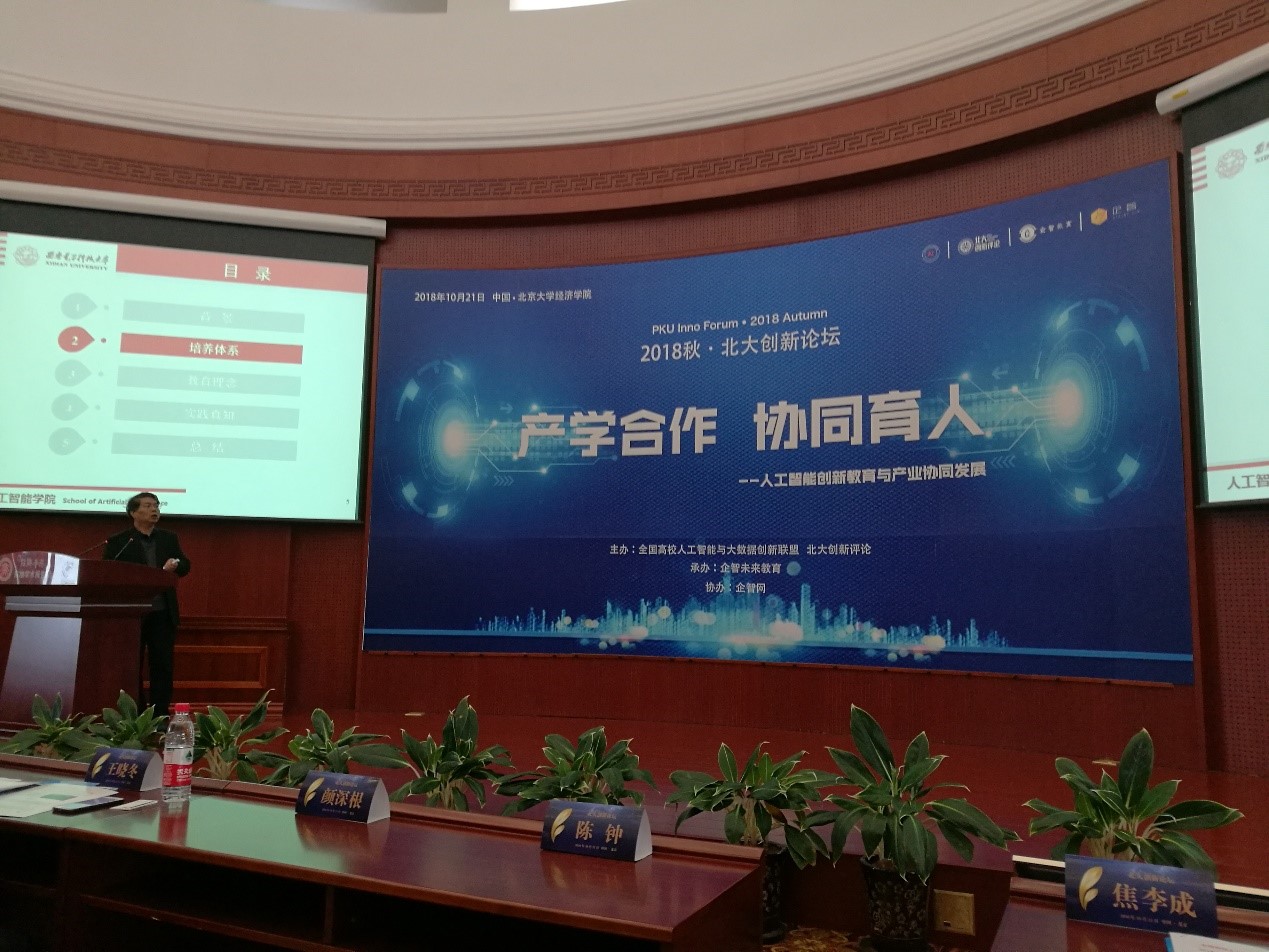 2018年10月21日,计算机科学与技术学部主任,国产的菊眼屁股HD焦李成教授受邀参加了由全国高校人工智能与大数据创新联盟主办的“产学合作 协同育人”2018全国高校人工智能与大数据教育教学创新论坛暨北大创新评论峰会,并做了题为“人工智能国际化创新人才的培养与实践”学术报告。