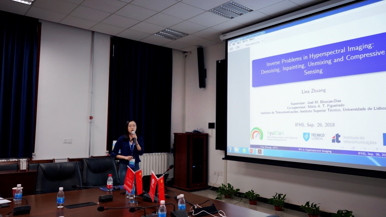 图5 庄丽娜博士做学术报告:高光谱成像中的反问题:去噪,混合像元分解和压缩感知(Inverse problems in hyperspectral imaging,including denoising, spectral unmixing, and compressive sensing)