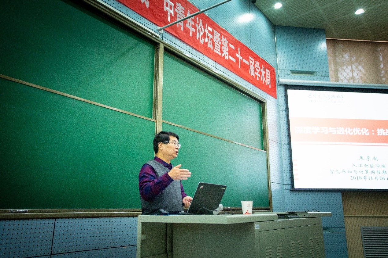 焦李成教授在报告中介绍了深度学习与进化优化之间存在的挑战与公开问题,从人工智能与机器学习和深度学习之间的联系、深度学习的前沿与挑战、进化优化的前沿与挑战、深度学习与进化优化的研究思考四个方面进行了详细阐述。