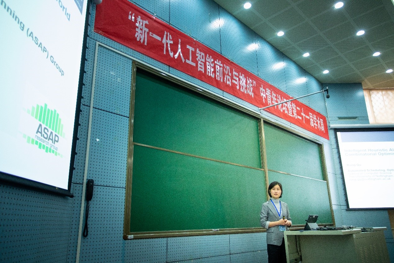 屈嵘教授的报告从组合优化问题的实际应用与超启发式算法的若干理论分析两个角度作出了讲解。在解决实际问题时通常从问题数学建模出发,希望使用传统数学规划方法给出问题的下界,但往往面临问题复杂度过高和计算时间代价无法接受等困难,因而转向启发式搜索方法进行优化求解以期待在有限计算下获得更优的结果。她从护士排班,港口运输车队任务调度,机场飞机起飞顺序规划等实际问题入手,细致讨论了优化目标选取、约束处理、优化算法选择等关键细节。