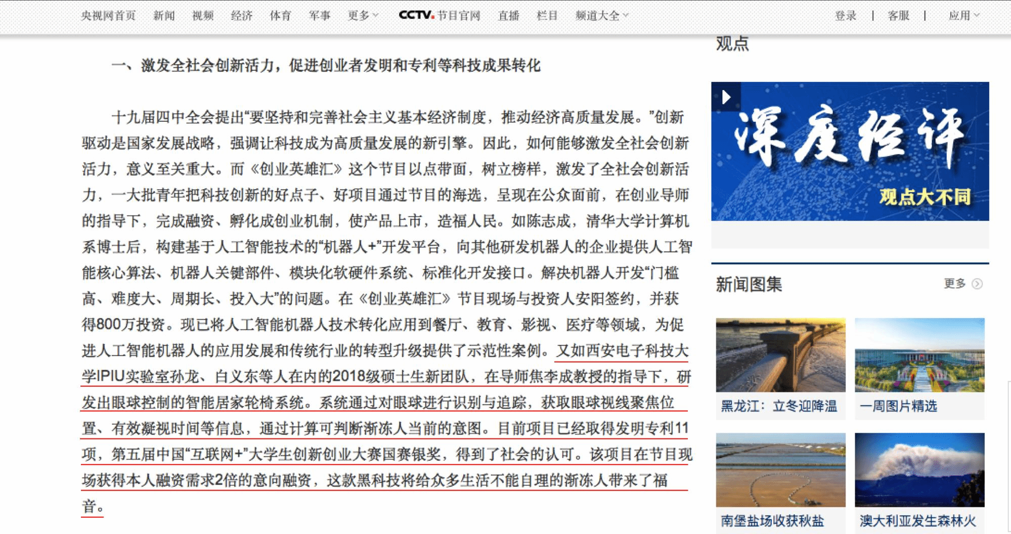 《创业英雄汇》栏目作为央视财经频道改版案例,在央视网分享节目经验中选取了四位创业者,以他们的创业经历为例,分享他们的创业故事,来激发全社会的创新活力,眼控轮椅创始人孙龙就在其中。“西安电子科技大学智能感知与图像理解教育部重点实验室孙龙、白义东等人在内的2018级硕士生新团队,在导师焦李成教授的指导下,研发出眼球控制的智能居家轮椅系统。系统通过对眼球进行识别与追踪,获取眼球视线聚焦位置、有效凝视时间等信息,通过计算可判断渐冻人当前的意图。目前项目已经取得发明专利11项,第五届中国“互联网+”大学生创新创业大赛国赛银奖,得到了社会的认可。该项目在节目现场获得本人融资需求2倍的意向融资,这款黑科技将给众多生活不能自理的渐冻人带来了福音。”央视网站这样写道。