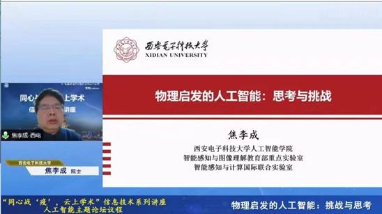 2022年1月1日,欧洲科学院外籍院士、俄罗斯自然科学院外籍院士、IEEE/IET/CAAI/CCF/CIE/CAA Fellow、西安电子科技大学计算机科学与技术学部主任、人工智能研究院院长、华山学者杰出教授焦李成受邀参加新年第一课——“同心战疫云上学术”信息技术系列讲座,并做了题为“物理气启发的人工智能:挑战与思考”的报告。