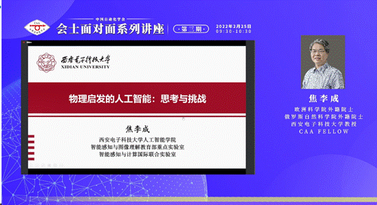 2022年2月25日上午,欧洲科学院外籍院士、俄罗斯自然科学院外籍院士、IEEE/IET/CAAI/CCF/CIE/CAA Fellow、西安电子科技大学计算机科学与技术学部主任、人工智能研究院院长、华山学者杰出教授焦李成受邀参加由中国自动化学会为学会会士量身打造的高端学术交流平台——CAA会士面对面系列活动第三期,做了题为“物理启发的人工智能:挑战与思考”的报告。