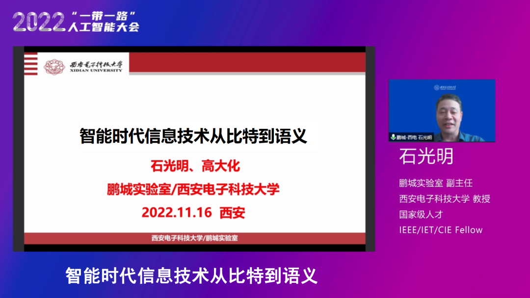鹏城实验室副主任、IEEE /IET/CIE Fellow、西安电子科技大学石光明教授首先对信息技术做了阐释。传统的信息技术以比特为基础,以系统复杂度换取性能增益。但随着信息技术的演进,通信系统需求逐渐从信息传递变为增强情感体验。通信的本质是内容的传输,但其更重要的目的是达意,即体验的再现。未来的6G通信包含了更多的场景与需求,如沉浸式服务、个性化服务、极端性能需求、通感融合等,特别是从信号向内容的转变,这些应用已经不能单纯通过增加天线、带宽、功耗等资源来实现。香农理论指导了过去几十年通信行业的发展,但它主要关注数据比特传输,很难继续指引通信向未来目标发展。未来通信的目标一定是:极低时延、最少资源、广泛链接、准确达意和正确理解。