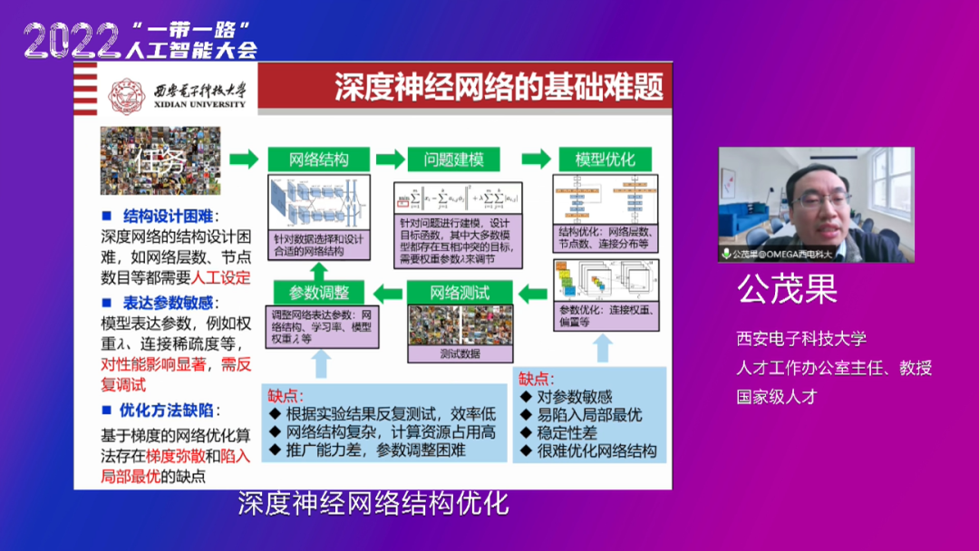 国家级人才、西安电子科技大学公茂果教授的报告介绍了团队近期在解决深度神经网络结构优化难题上的一些思路和尝试,以及在深度神经网络应用上的一些新进展。公茂果教授的报告从四个方面展开,第一,深度神经网络的优势和困难。深度神经网络的优势包括:深层结构,复杂建模,特征学习,自主分析,推广性强,应用广泛。深度神经网络的困难包括:结构设计困难、表达参数敏感和优化方法缺陷。第二,深度神经网络结构优化初探。具体分为以下五个方面:1.避免表达参数。2.超越梯度优化。团队提出的自然梯度优化结合了华为昇腾AI计算芯片中使用的达芬奇架构,可以批量化的计算小矩阵的逆,能够进一步提升计算效率。3.神经网络压缩。团队提出了网络流数据分类的神经网络压缩方法,将生成对抗训练和知识蒸馏相结合,并对网络重要性因子进行稀疏约束,达到网络裁剪目的,得到压缩率与准确率的平衡。4.隐私保护学习。针对数据分散且无法集中收集或共享的问题,团队提出了多方对偶学习,通过对偶预测补全缺失数据,保持原有数据结构不变,重叠验证扩充训练数据。此框架同时保护了数据隐私性和计算安全性。5.训练样本学习。团队提出了SPL模型和MOSPL模型,通过协同训练产生预测概率对节点进行排序,采用自步学习逐步将节点加入到训练集中,一方面将高置信度的伪标签扩充至训练集,另一方面减轻难以分类的节点对模型训练产生的扰动。第三,遥感影像变化检测应用探索。公茂果教授从遥感影像变化检测、多类变化检测、超像素变化检测、多视角变化检测、特定目标变化检测以及高光谱影像变化检测等多个方面进行了应用探索。最后,公茂果教授对深度神经网络结构优化的未来发展方向进行了展望。