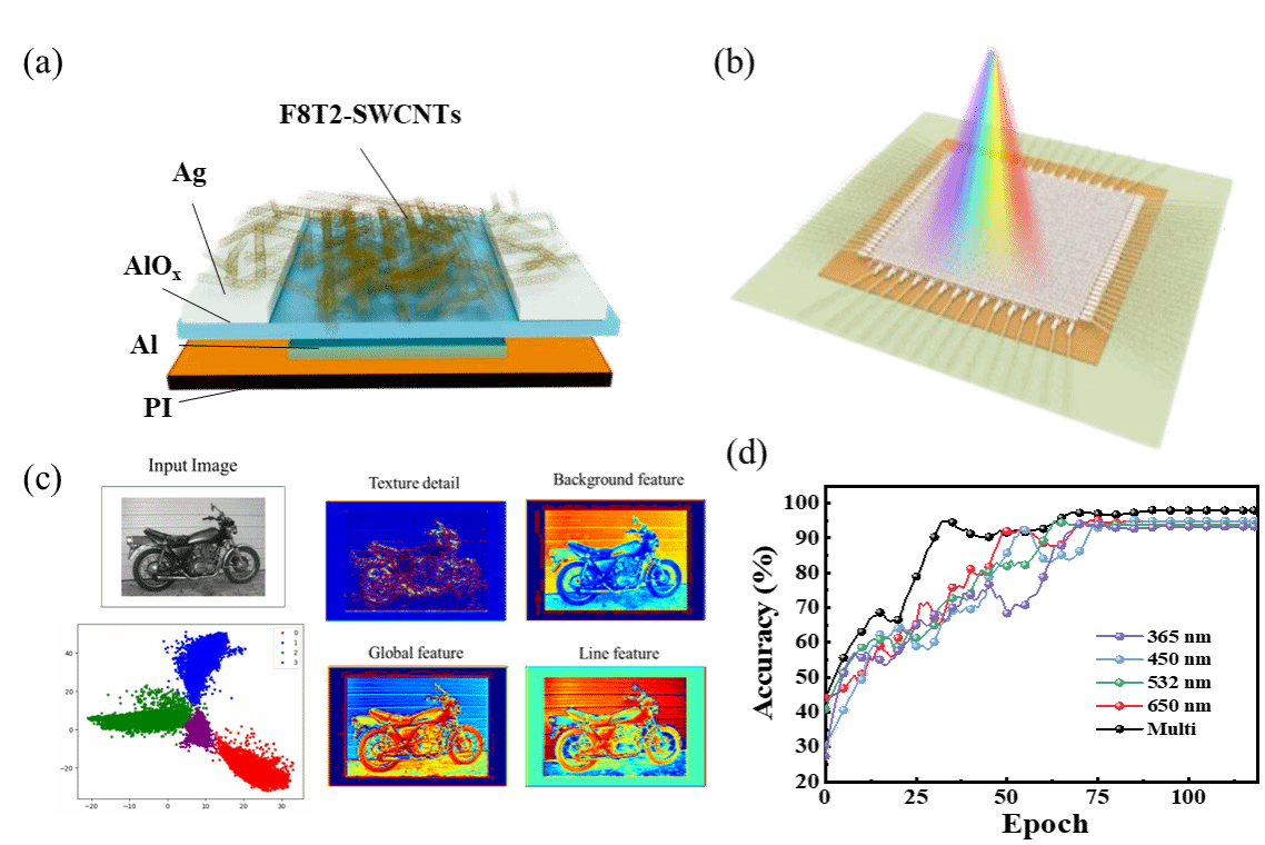 受此启发,文章中利用光敏共轭聚合物(poly[(9,9-二辛基芴基-2,7-二基)-co-(联苯)],F8T2)分类半导体单壁碳纳米管(sc-SWCNTs)作为通道材料,报道了新型宽带(从365 - 940 nm)和多级存储光电突触薄膜晶体管(TFT)阵列。